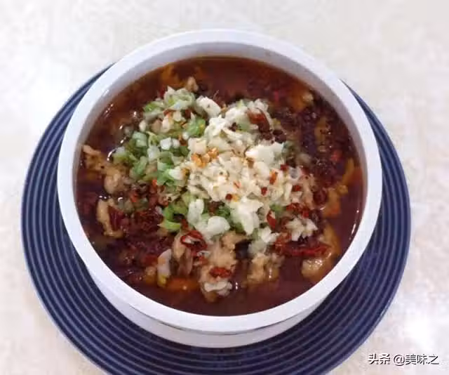 8、連肉帶湯倒入碗中,放上蔥花、蒜蓉、紅辣椒碎、花椒粒。