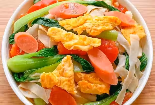 步驟一:番茄洗凈以後,切成小塊兒。兩個雞蛋炒熟,盛出備用。杏鮑菇切掉頭部,洗凈,用削皮刀削成薄薄的長條。青菜洗凈,火腿切薄片。