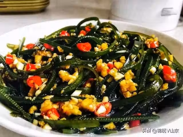 3.海帶加生抽,白糖,陳醋,鹽,拌勻,再加上爆香的蒜,姜趁熱淋到海帶上,裝盤即可。