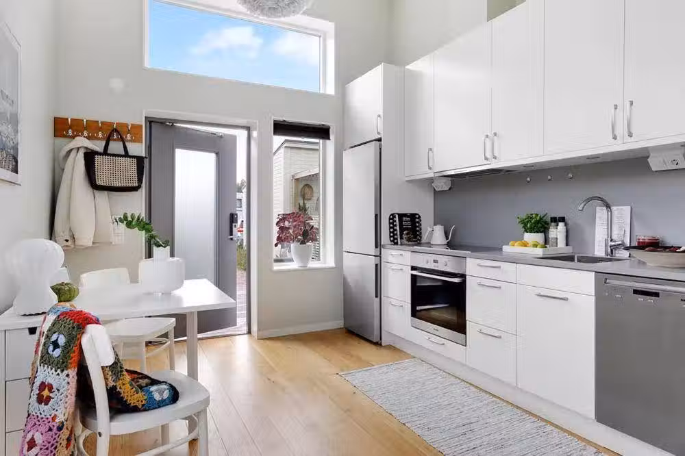 整個房間的右側區域都被開放式廚房所占據,廚房的上下兩部分都是小姐姐精心設計的豐富櫥櫃,用來存放各種廚具和餐具剛剛好。中間部分採用淺灰色的背景墻,更加凸顯高級感和藝術氛圍。