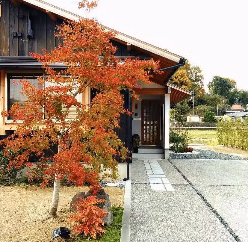 客人需要經過玄關進入室內,最後才能看到院落景觀,玄關與院落是相反的兩個方向。 即便如此,屋主還是在靠近玄關的位置種上了楓樹,秋季到來,楓葉鮮紅一片,才忽覺古人詩句中「楓紅秋院鎖,孤獨好年華」的意境真美。