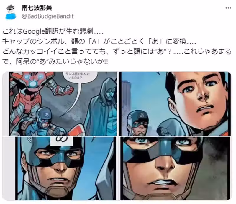 日本一位名叫「南七波那美」的X網友,最近透過「Google翻譯」閱讀美國超級英雄漫畫,發現美國隊長額頭上的「A」字,竟然被翻譯成了阿(あ)字。讓他瞬間覺得蠢到人設崩壞,相當傻眼!