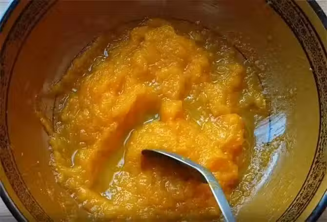 1.今天和大家分享一個南瓜發糕的做法,我會把重點都跟大家講解一下,保證做出的發糕不塌陷不回縮,鬆軟筋道,一次成功。首先我們準備一塊南瓜,洗凈去籽,去皮切成薄片後的重量約為250克,上鍋蒸熟,加入20克白糖,糖的量可以依據個人口味增減,按壓成細膩的南瓜泥,晾至溫熱,加入三克酵母,如果南瓜泥溫度過高,酵母會被燙死。
