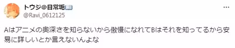 「A是只看話題作品,和改編自知名雜誌連載作品的人。B是深夜動畫會全部錄下來,頂多只有糞作不看的人。」