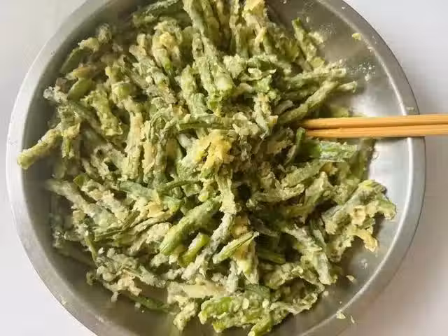 1、長豆角切成小段,加入少許食用油和一個雞蛋拌勻,少量多次加入足量的麵粉里勻。