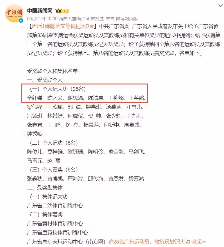 北京時間8月21日下午,根據《中國新聞網》的消息,廣東省就第33屆夏季奧運會獲獎運動員及其教練員進行獎勵,個人記大功有25人排在第一的就是全紅嬋,全紅嬋、陳藝文、謝思埸三人的地位大家一目了然。