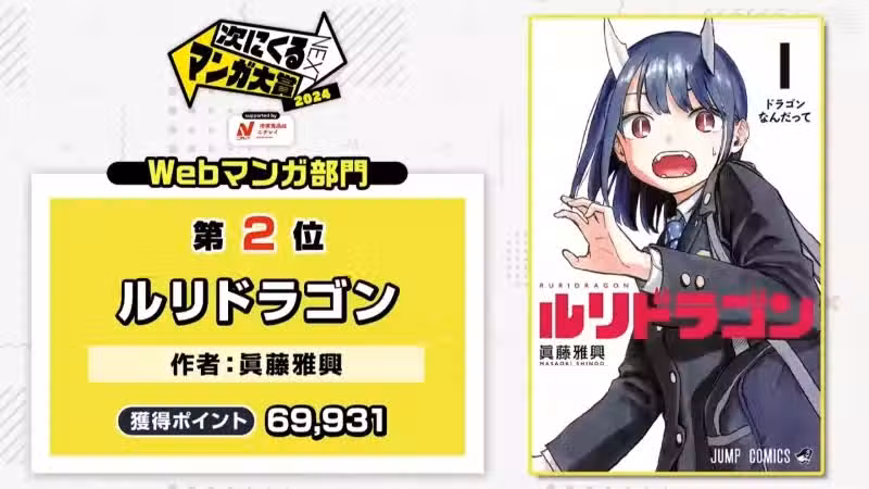 日本大型漫畫獎項「次にくるマンガ大賞」最近公布了2024年的得獎名單。其中在「網絡漫畫」的類別當中,曾在雜誌《周刊少年JUMP》連載,後來因為作者健康理由,轉往電子版繼續連載的人氣漫畫《瑠璃龍龍》,就獲得了第二名的肯定。