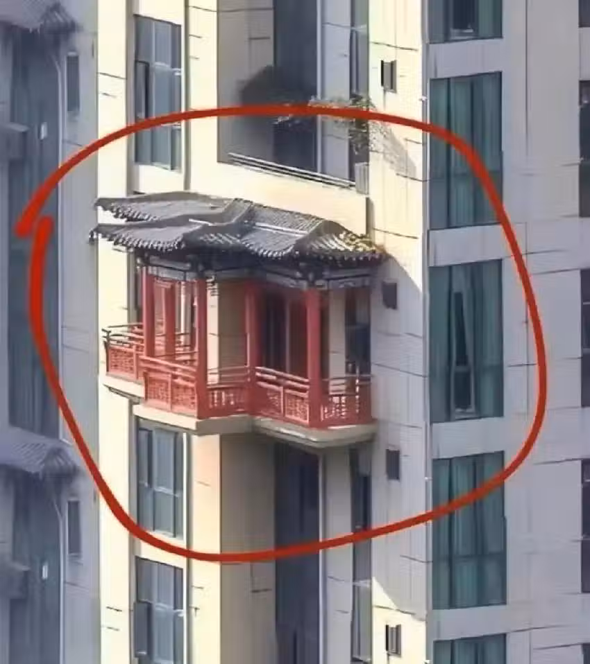 照片中,高樓住宅的一角赫然出現了一個仿古式樣的陽台建築,紅色的柱子、精緻的飛檐與普通現代樓房形成了鮮明對比,宛如一座迷你古代樓閣嵌入了高樓大廈中。