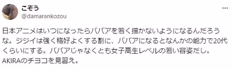 這位暱稱「こぞう」的日本X網友,最近發文批評日本動畫中的老婆婆都畫得太年輕了,隨即引發了議論!