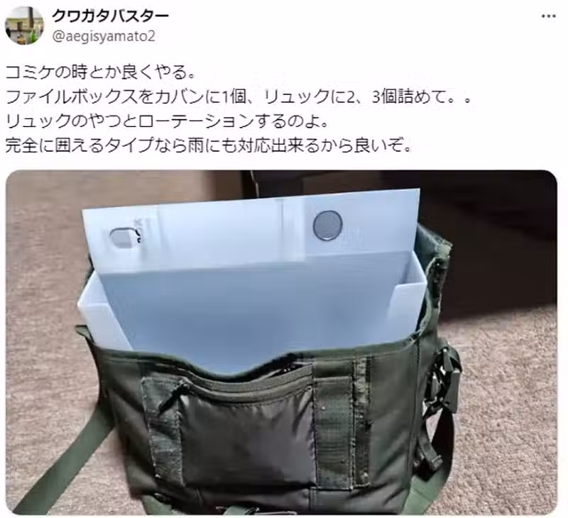 「這招真的很推。我是為了追求輕量化,所以選擇了大創的PP文件收納盒。因為可以摺疊,所以不用的時候收納起來也很方便。貴一點220日圓的還有附蓋子,在場內買同人誌的時候,可以先將蓋子反折比較好放。離場需要遮風蔽雨的時候,再把蓋子蓋起來提升防禦力。我真的很愛用有蓋的。」