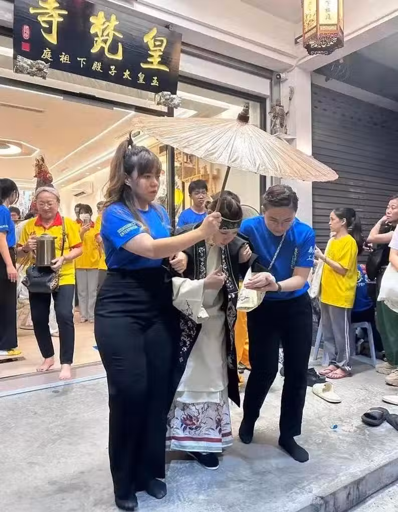 近期日有民眾看到一位年輕「女乩身」穿古代老婦人服裝,且頭上還撐著紙傘需要人攙扶,讓他好奇詢問,「這是什麼神降駕?」照片曝光後,引起熱論,更有人揭露真相。