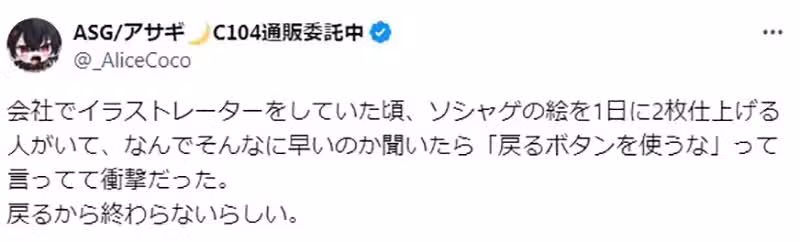 日本繪師ASG(アサギ)最近在X發文,分享了以前在遊戲公司上班的時候,有位畫畫超快的同事,竟然是靠著「不要按還原鍵」提高交稿速度。