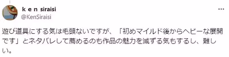 「要是給人家『別看畫風這樣,其實憂鬱元素很多,做好心理準備』這種忠告的話,感覺就跟暴雷一樣,這才算是不尊重作品吧……所以該怎麼推薦才好啊?」