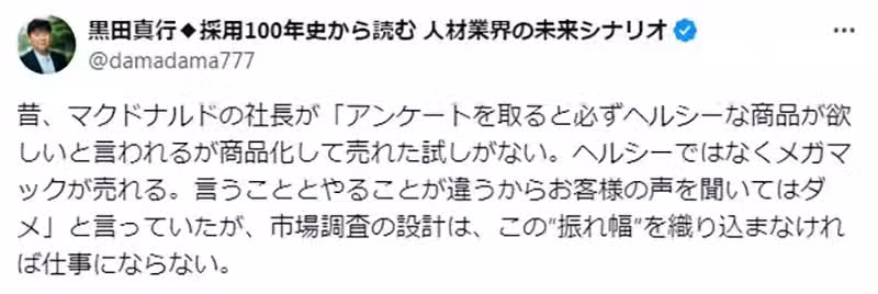 日本一位獵人頭公司老闆兼商業書作家黑田真行(黒田真行),最近在X發了上面這篇文,聊起公司或經營者不應該完全聽從顧客意見的事情。