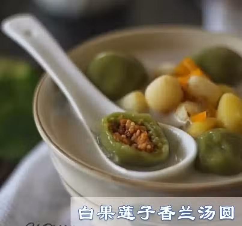 材料:香蘭湯圓 1份,蓮子 100克,白果 70克,南瓜 84克(切絲),沙谷 30克,清水 1000毫升,濃椰漿 200毫升,糖 適量