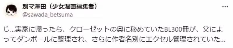 日本一位名叫「澤田」的少女漫畫編輯,最近分享了她放在老家衣櫃衣櫃的上百本BL書,不但被爸爸發現,還被拿出來仔細分門別類的事情,引爆了超過10萬人按贊的熱烈反響!