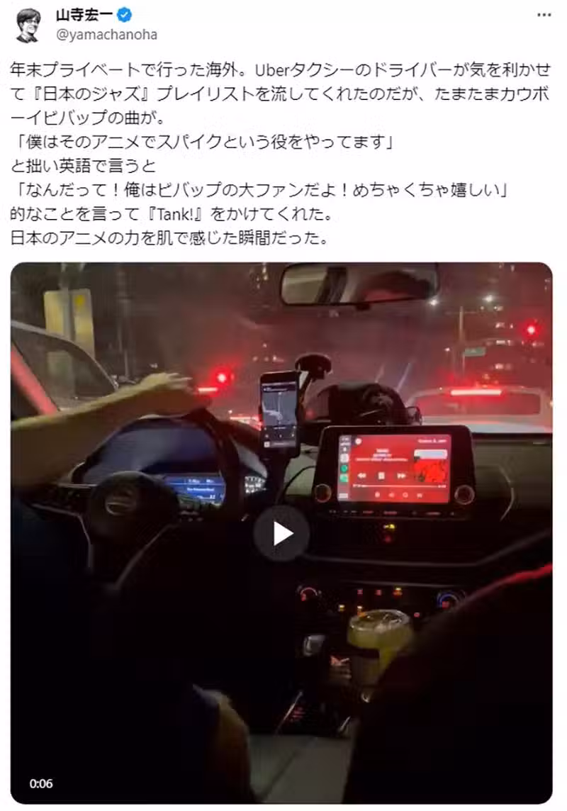 日本資深聲優山寺宏一,最近分享了自己出國旅遊的時候,搭上了《星際牛仔》粉絲駕駛的Uber的事情……