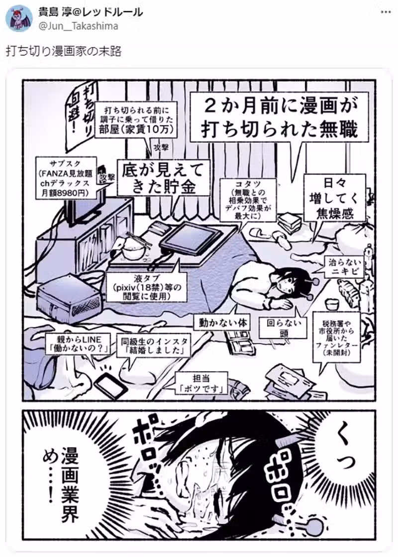 《漫畫家貴島淳》分享作品慘遭腰斬的結果,經濟壓力和新連載壓力讓他心力交瘁