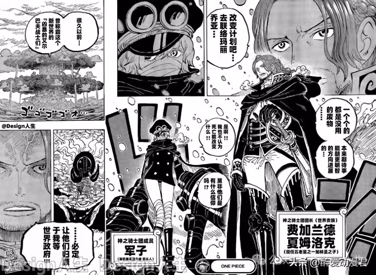 在上一話的結尾,神秘的天龍人來人身份終於曝光,原來他是神之騎士團新任團長夏姆洛克,五老星加林聖的兒子!