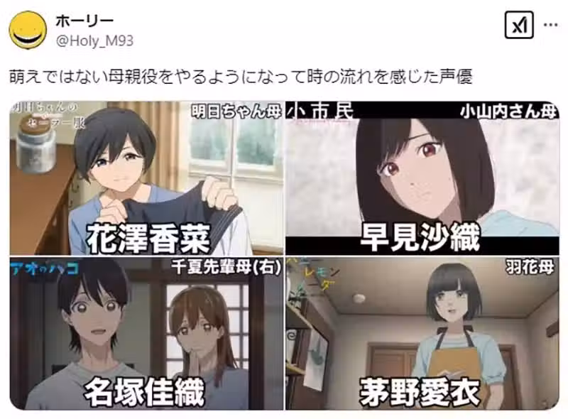 這位暱稱「ホーリー」的日本X網友,最近舉出了幾位女性聲優,並且表示當她們替動畫中的母親角色配音的時候,讓他感觸良多!