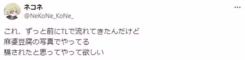 「我看到有人留言說:『把麻婆豆腐放進眼睛就會改善哦。』於是我就嘗試畫看看,後來才發現原來他的意思是『把麻婆豆腐的照片當成紋理貼上去』啊。」