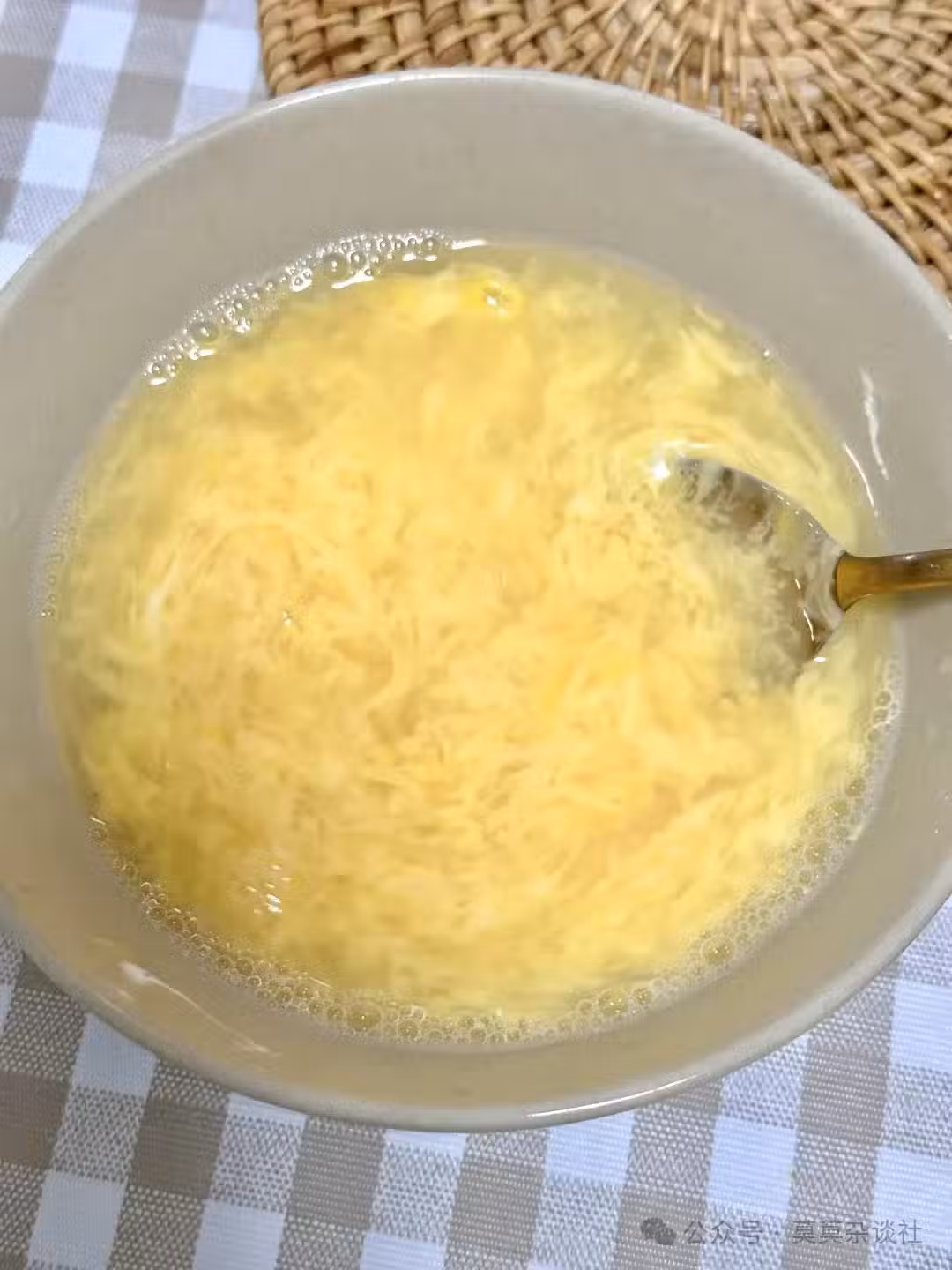 雞蛋打散,水燒開後,從高處沖入雞蛋液,快速攪拌均勻。