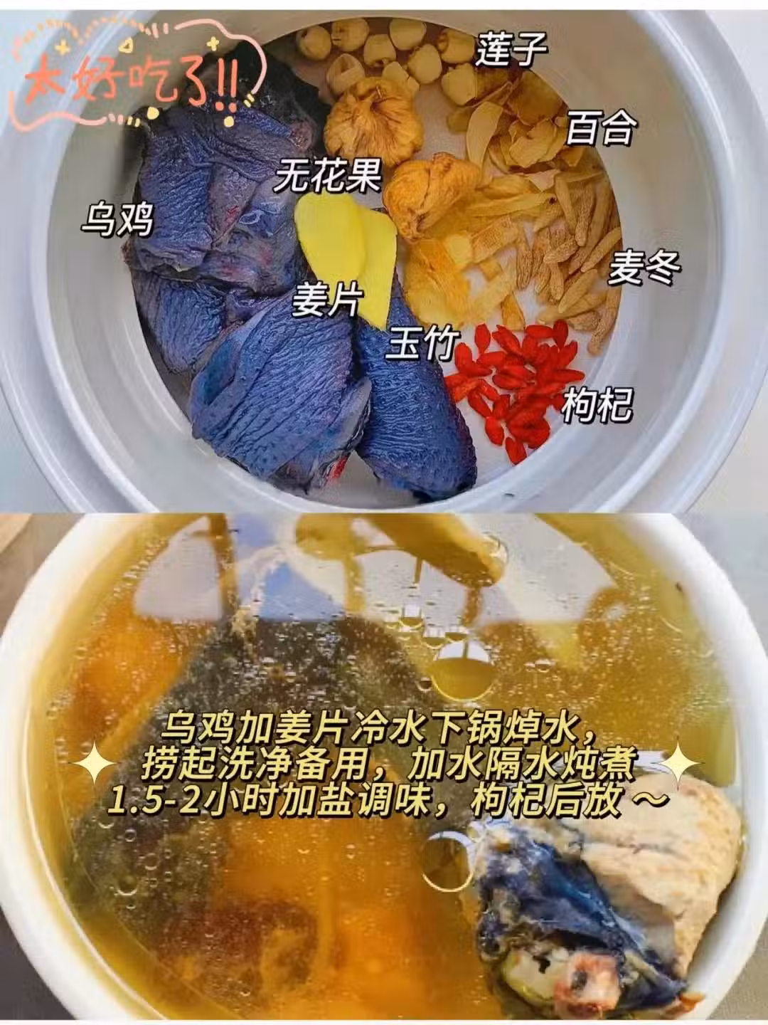 ②燉煮時間可根據烏雞的老嫩程度適當調整,老烏雞可適當延長燉煮時間。