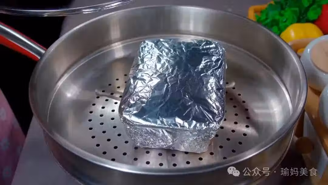 6.時間到了我們關火再燜5分鐘,然後打開蓋子取出來,我們把上面的錫紙揭掉,放涼之後倒出來,切成自己喜歡的形狀就可以吃了。