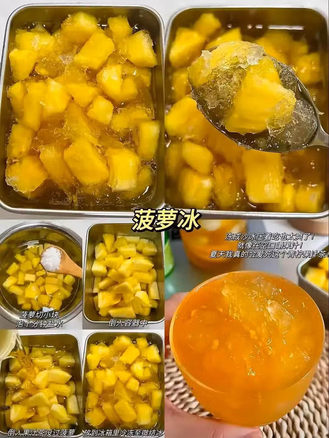菠蘿冰:東南亞街頭穿越裝置,菠蘿切塊鹽水泡10分鐘,和冰塊一起捶打出汁,再倒入果汁茶沒過菠蘿。 吸管插進去的瞬間,38℃的客廳自動切換成芭提雅海灘模式。