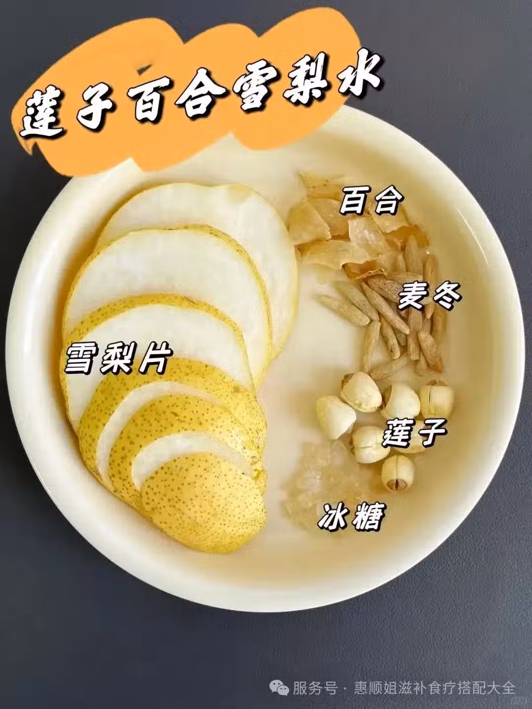 蓮子8顆、百合5克、雪梨1個、麥冬3克、適量冰糖