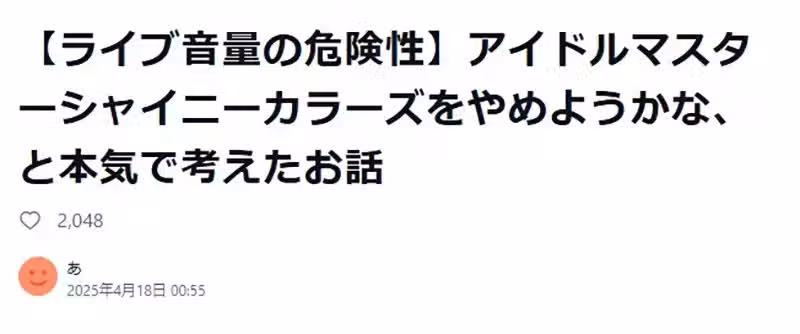 日本一位暱稱「あ」的日本網友,最近在部落格發表了一篇文章,分享自己參加《偶像大師 閃耀色彩》演唱會之後,導致聽力受損的事情,引髮網友們的議論!