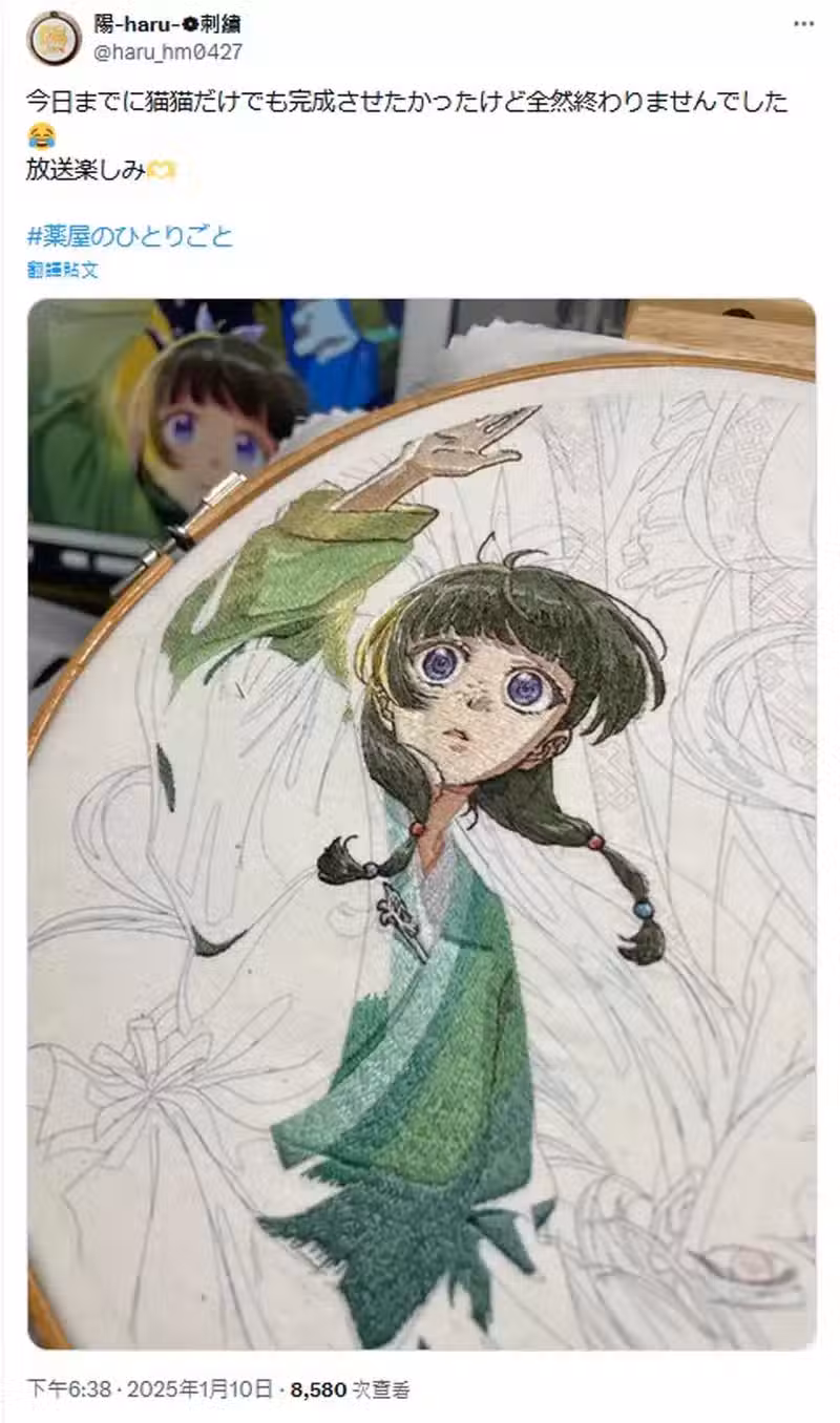 那麼推主從今年「藥師少女的獨語」第二季預告推出左右的那段時間,就開始縫製這次的作品,到完成除了花上了幾個月的時間以外,整幅作品也是一針一線去手工縫製,全部共139種色彩,也因為作品過於精細而且用新,所以作品質感看起來特別不一樣,宛如動畫般的精緻呈現圖片來自:haru_hm0427網友手工縫製 藥師少女的獨語 主角貓貓&壬氏