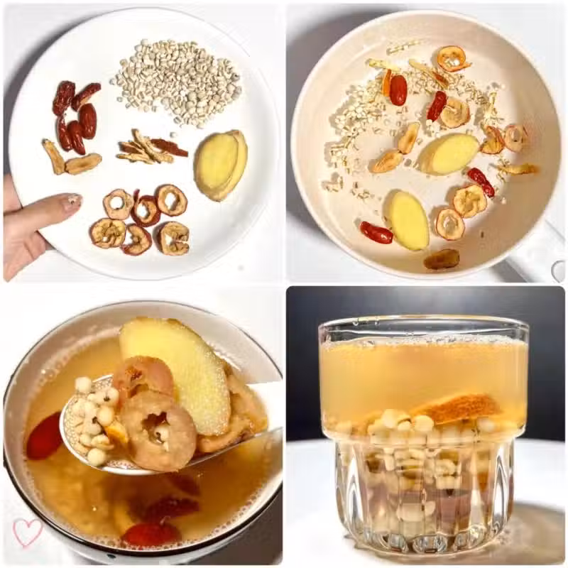 炒薏米15g、生薑2薄片、去核紅棗2顆、陳皮1小瓣、山楂干5片、清水1000ml