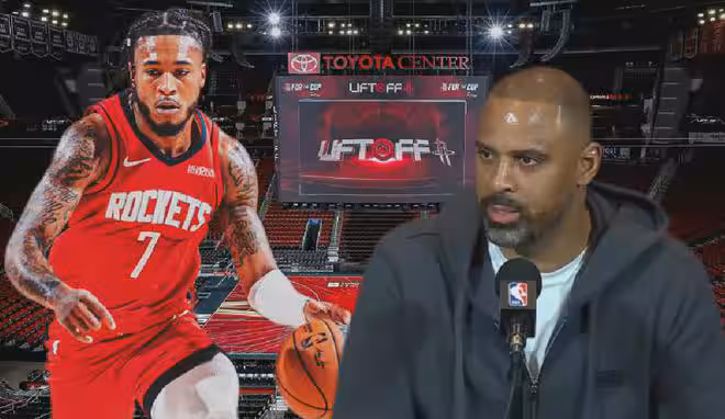 惠特摩爾,年僅20歲,23屆首輪第20號秀,身高2米01的側翼,兩個賽季的火箭生涯,常規賽場均出戰17.4分鐘,就能貢獻10.8分3.4板0.8助,三項命中率44.9%、35.7%和70.7%,身體天賦爆表就是可能不怎麼擅長打團隊籃球。