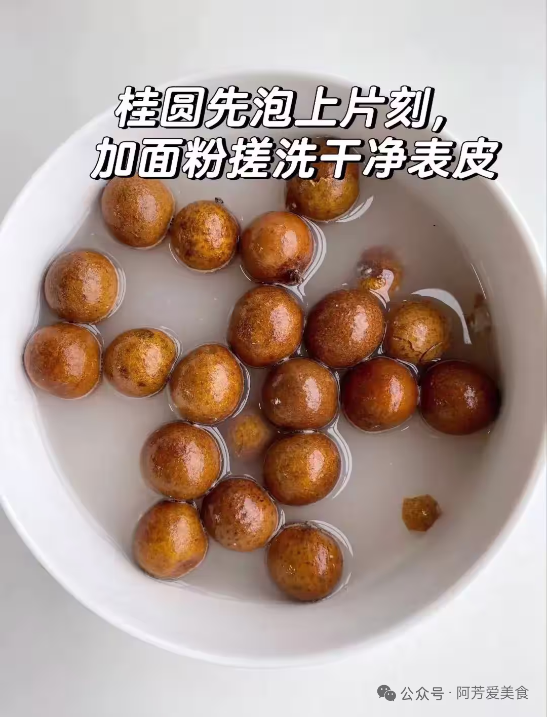 1.桂圓乾用麵粉水浸泡10分鐘,搓洗掉表面浮灰;