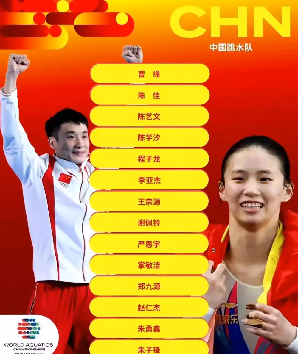 本屆世錦賽,中國跳水隊14人名單中6人為首次參賽,創下新老交替速度之最。女子10米台由陳芋汐搭檔掌敏潔(兩人5月全國賽奪冠),男子10米台則啟用14歲新人趙仁傑,這位此前未進過國家集訓隊的"素人選手",憑藉選拔賽黑馬姿態脫穎而出。四對雙人項目搭檔全部重組:男子雙人10米台程子龍/朱子鋒、混合雙人3米板程子龍/李亞傑等新組合首次亮相國際大賽。