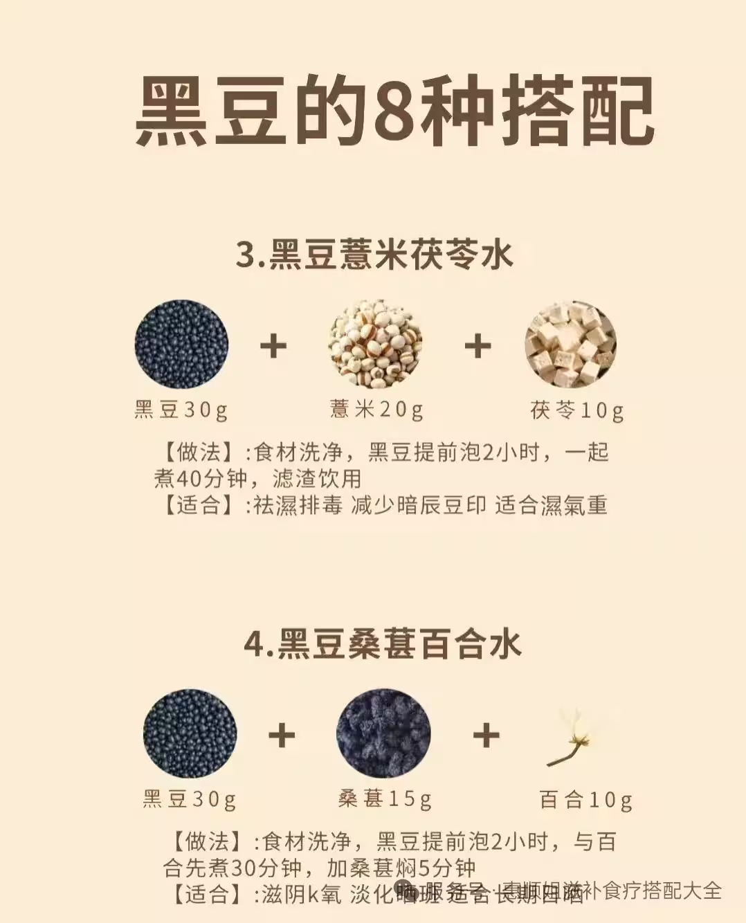做法:黑豆30g、薏米20g、茯苓10g,洗凈後黑豆提前泡2小時,一起煮40分鐘,濾渣飲用。