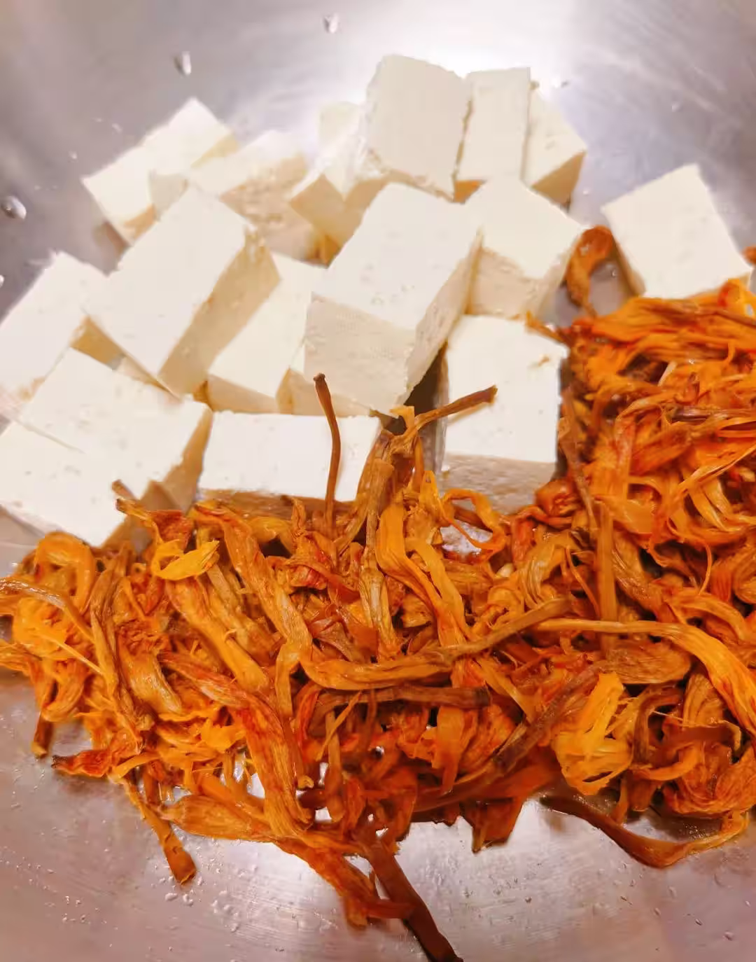 1️⃣黃花菜用溫水泡發,去根洗凈,豆腐切小塊