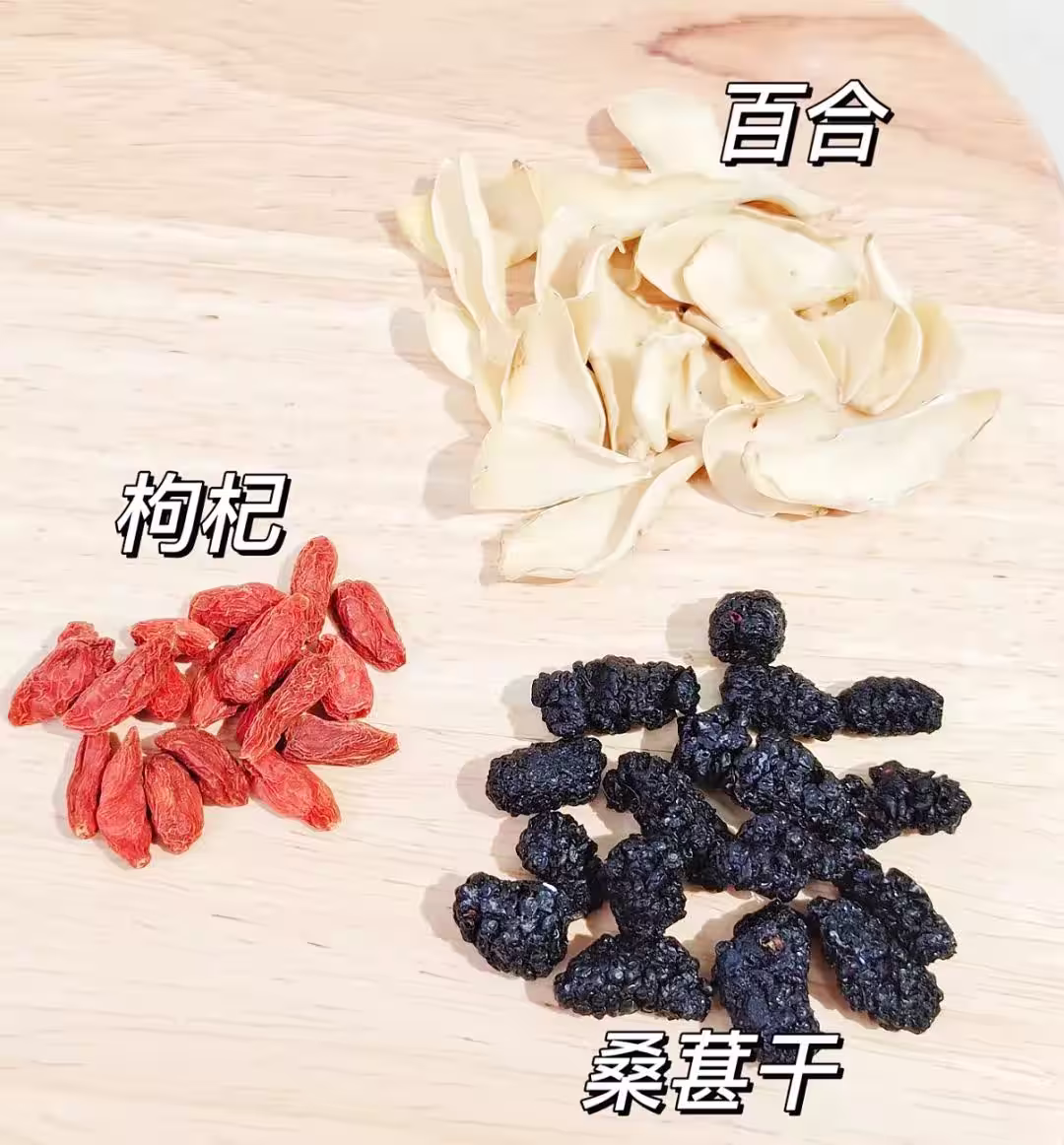 桑葚干20g、干百合20g、枸杞適量、冰糖適量