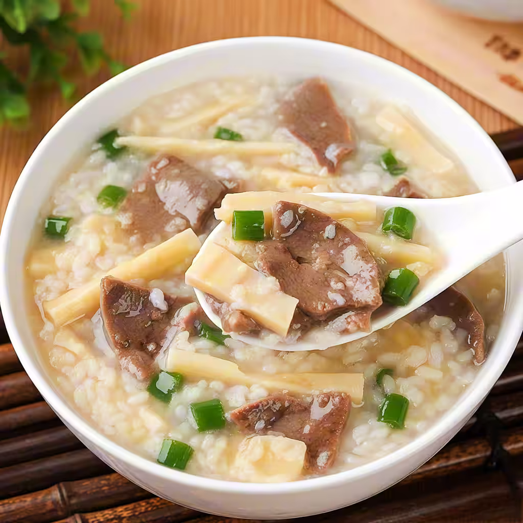 竹筍、豬肝焯水,粥煮好後加入,加鹽、味精調味,撒上蔥末、薑末即可。