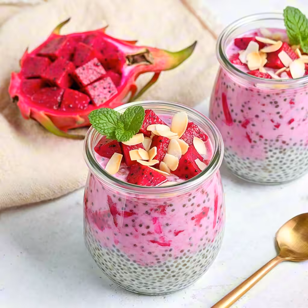 紅心火龍果1/4個、無糖酸奶200g、奇亞籽5g、藍莓10顆