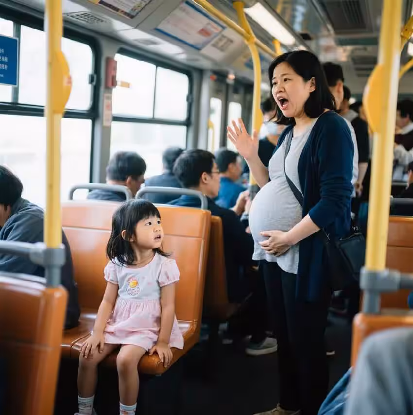 媽媽冷靜地回應道:「這位女士,我明白懷著孕乘車辛苦,但請您睜大眼睛看看,我女兒才6歲。