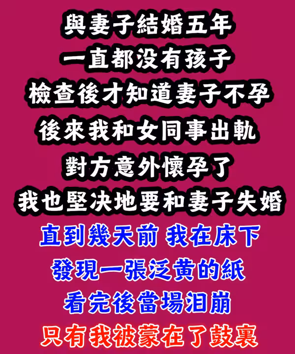 與妻子結婚五年,一直都沒有孩子,檢查後才知道妻子不孕。後來我和女同事出軌,對方意外懷孕了,我也堅決地要和妻子失婚。直到幾天前,我在床下「發現一張泛黃的紙」看完後當場淚崩:只有我被蒙在鼓裡…