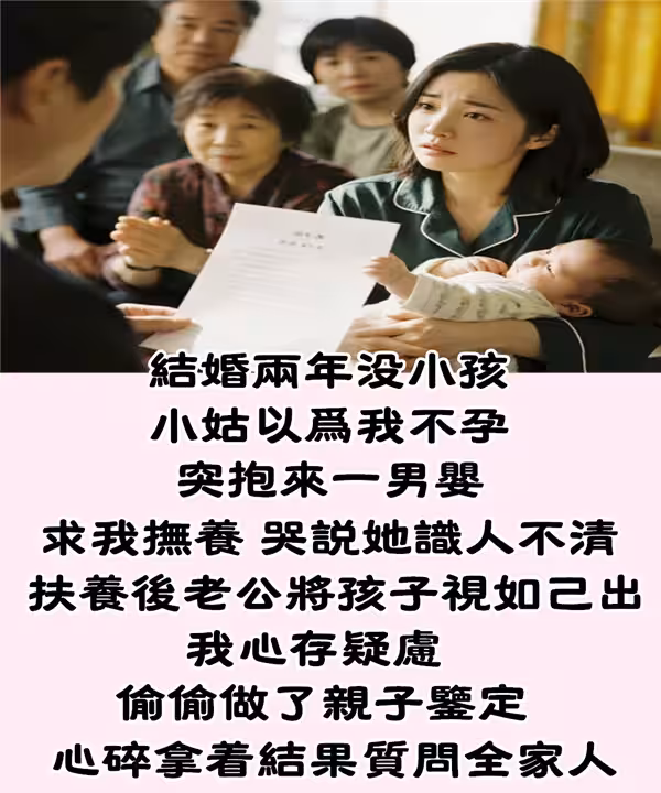 結婚兩年沒小孩!小姑以為我不孕「突抱來一男嬰」要我撫養,哭說她識人不清,扶養後老公將孩子視如己出,我心存疑慮「偷偷做了親子鑑定」心碎拿著結果質問全家人