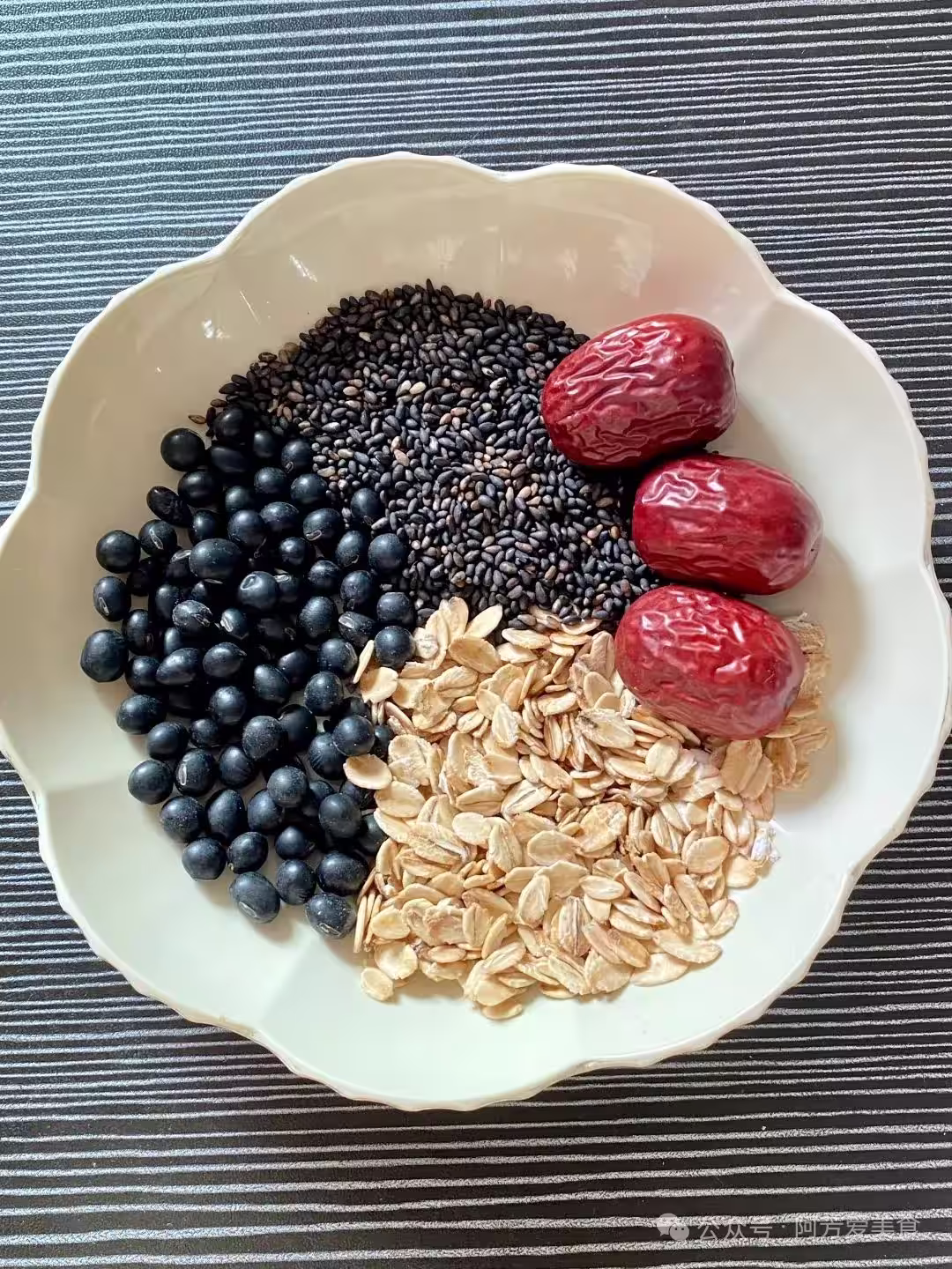 所有材料加600ml水,用米糊功能攪打25分鐘。倒出來是稠嘟嘟的灰褐色,浮著一層亮晶晶的芝麻油皮。