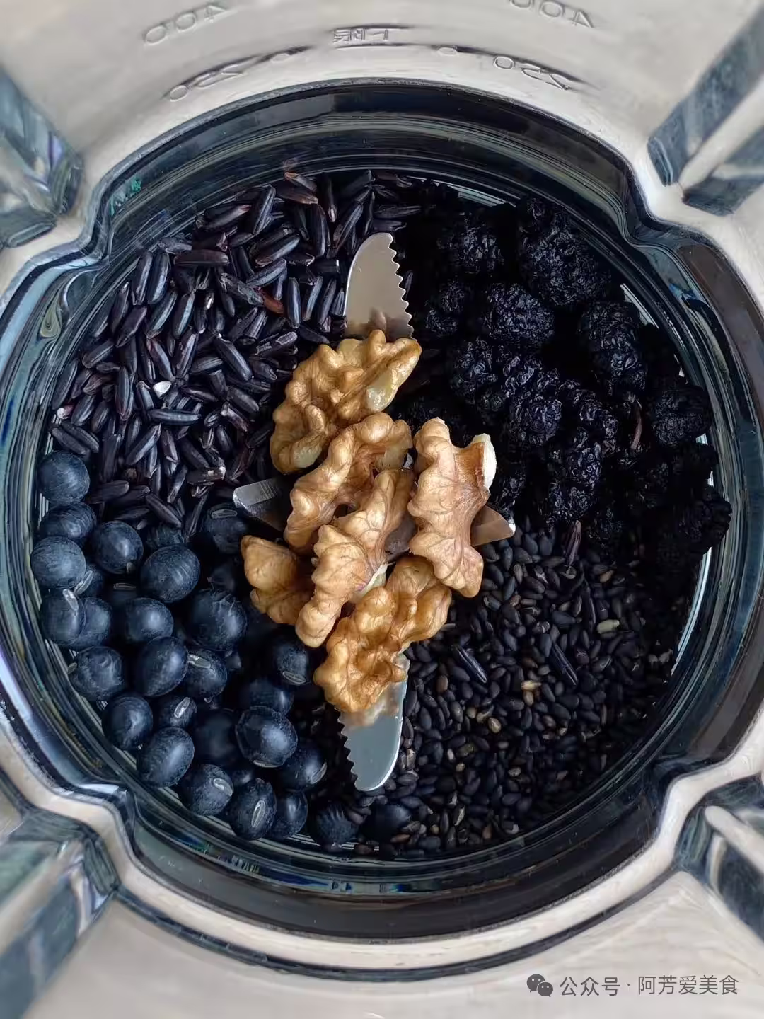 食材:黑豆10g、桑葚干10g、黑枸杞1g、黑米10g。桑葚枸杞免洗,黑米黑豆浸泡過夜。