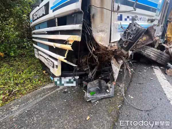 貨車司機林先生雖然平安無事,但車輛左前輪整個脫落,車頭板金嚴重損壞。