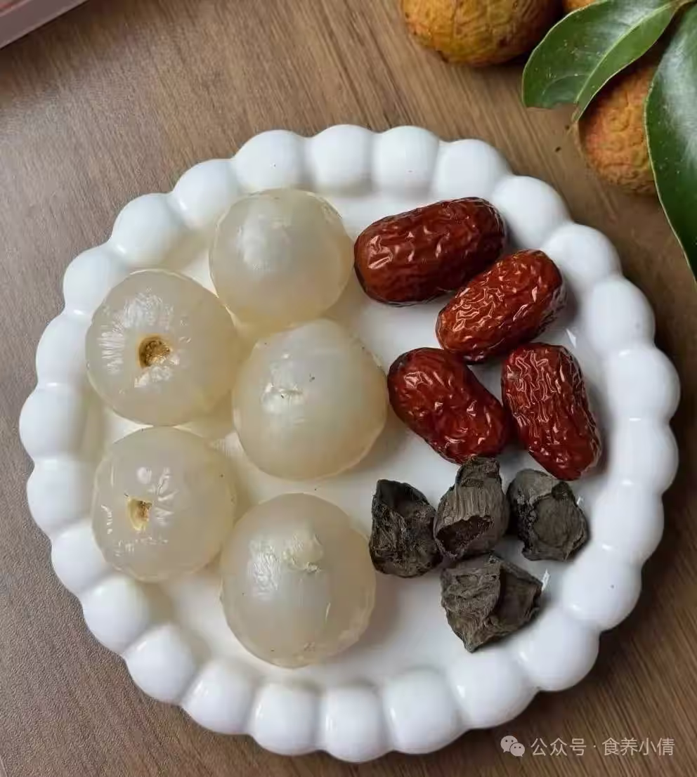 食材: 新鮮荔枝肉8-10顆、老薑薄片3片(約拇指大小)、去核紅棗3顆、陳皮一小瓣(約1克)。