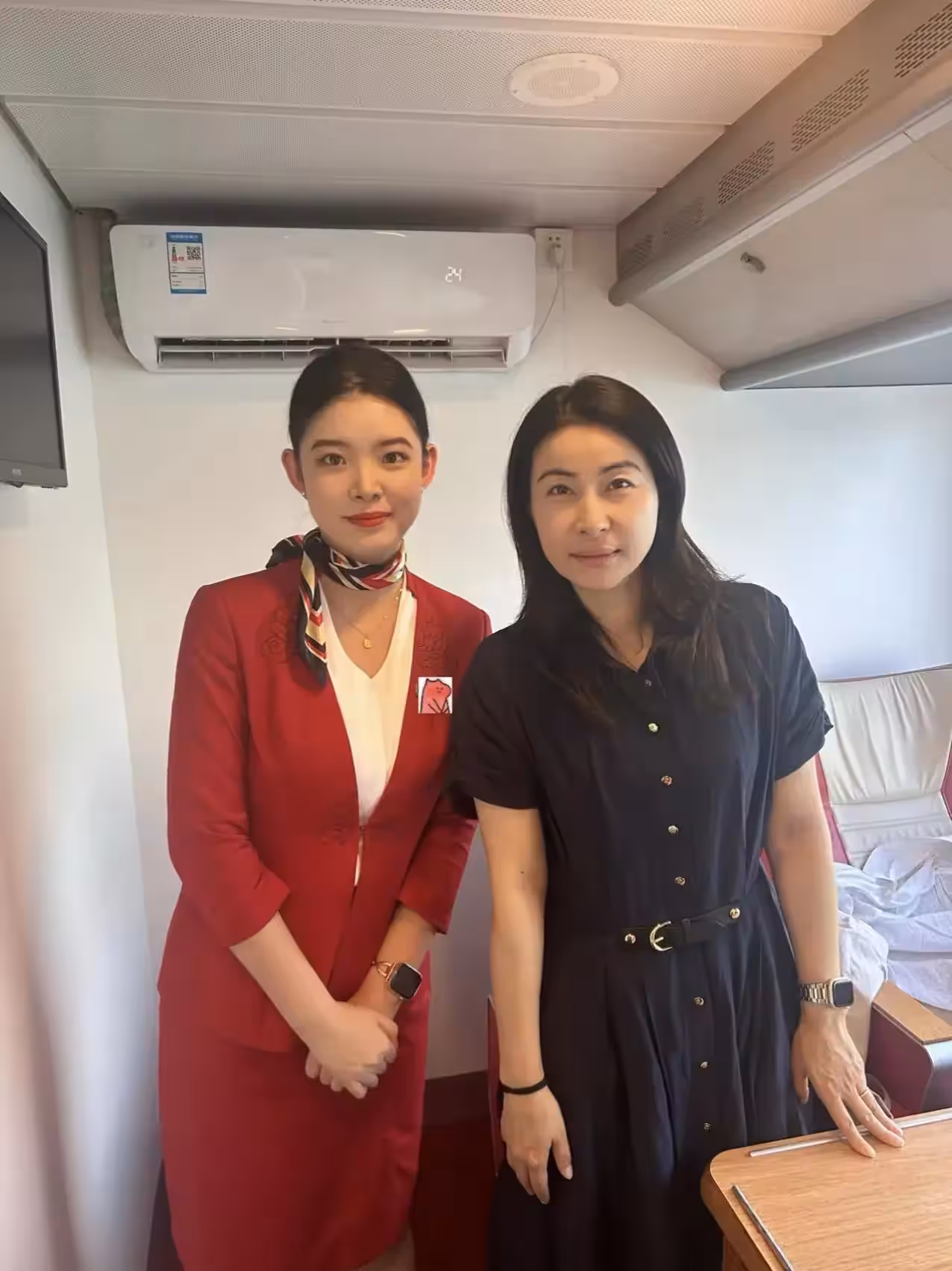 43歲郭晶晶坐商務艙出行,和空姐一起合照,臉部素顏狀態非常好