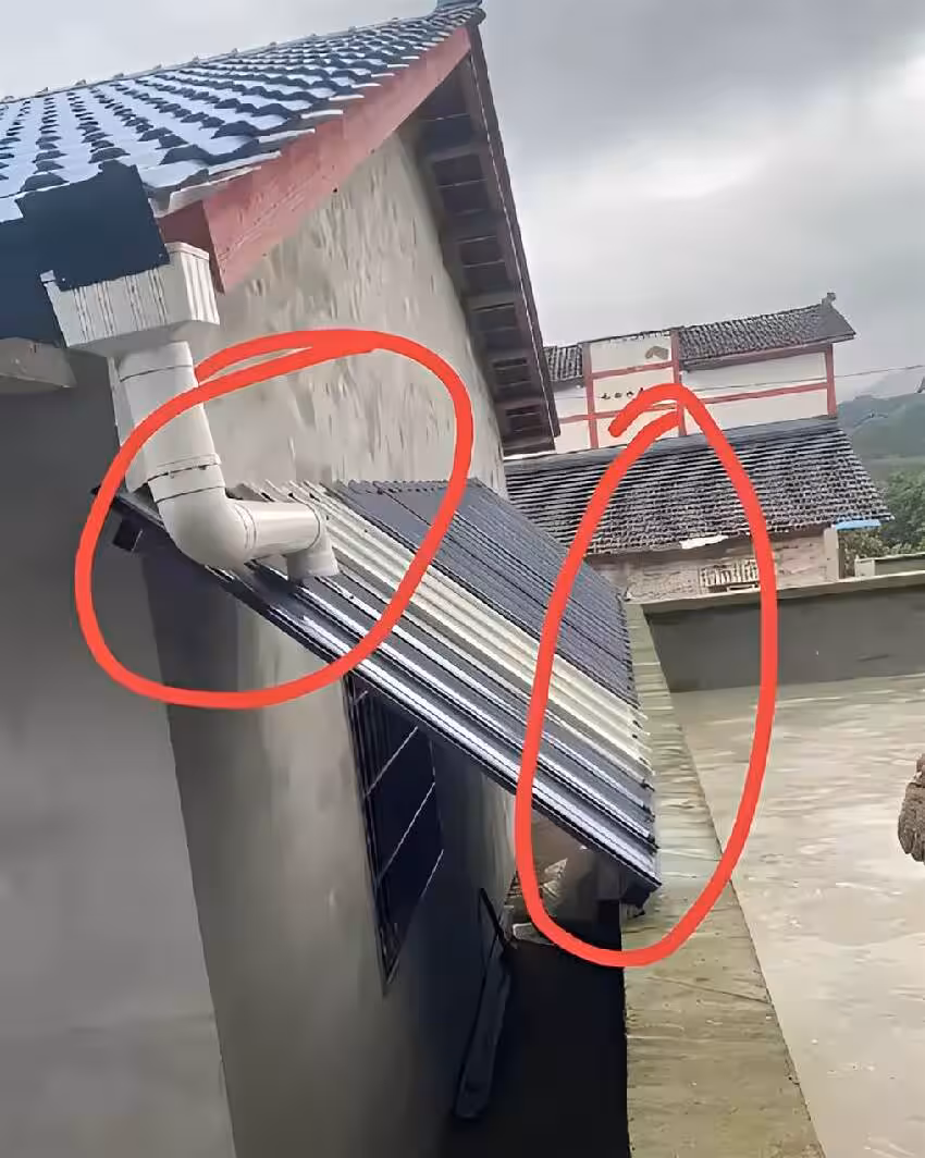 鄰居在屋頂的下水管搭了一個斜板,將雨水直接引到我家的屋頂,讓水通過我家的平房流走。